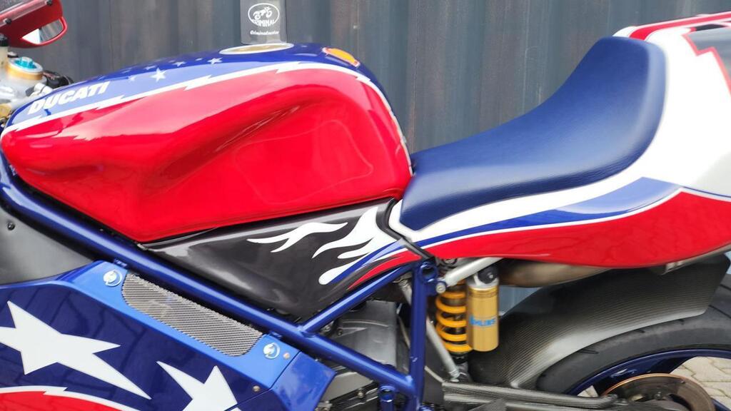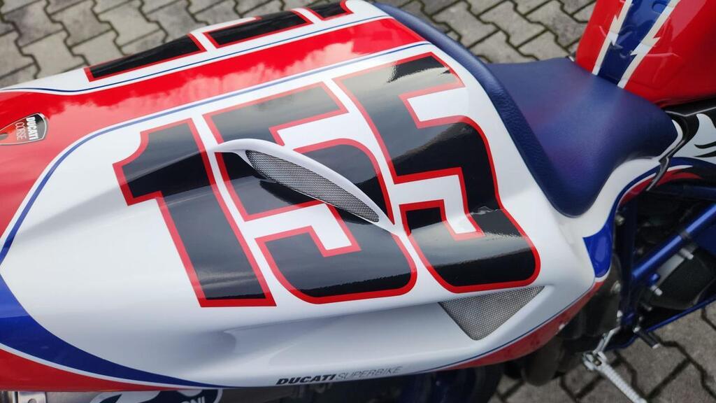Ulteriori informazioni: E' UNA DELLE 155 DUCATI 998S PRODOTTE NEL 2002 PER IL MERCATO EUROPEO IN OMAGGIO AD UNO TRA I PILOTI PIÙ AMATI DELL'EPOCA D'ORO DELLE DERIVATE E VINCITORE DI SEI GARE CONSECUTIVE NEL MONDIALE SBK 2001 (CHE GLI VALSERO IL QUARTO POSTO A FINE STAGIONE) IN SELLA ALLA 996R DEL TEAM L AND M. SOTTO LA LIVREA ROSSA E BLU PORTA IN DOTE UN MOTORE BICILINDRICO A L TESTASTRETTA DA 998 CC E 136 CAVALLI INCASTONATO IN UN TELAIO A TRALICCIO ABBINATO A UNA TRASMISSIONE A SEI MARCE, SOSPENSIONI ÖHLINS REGOLABILI, CERCHI MARCHESINI E FRENI BREMBO.Fornita di targhetta identificativa,
