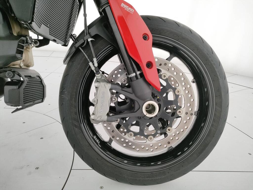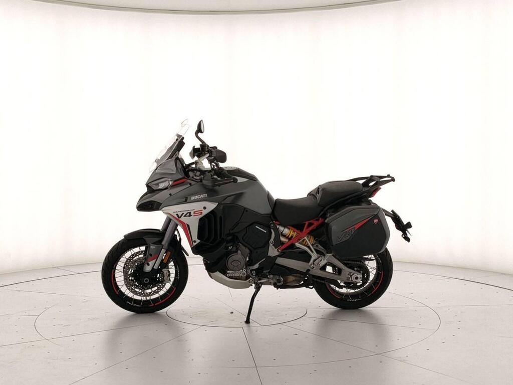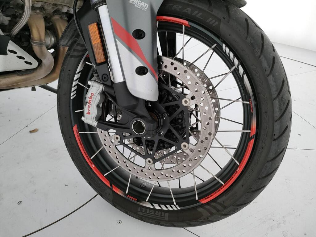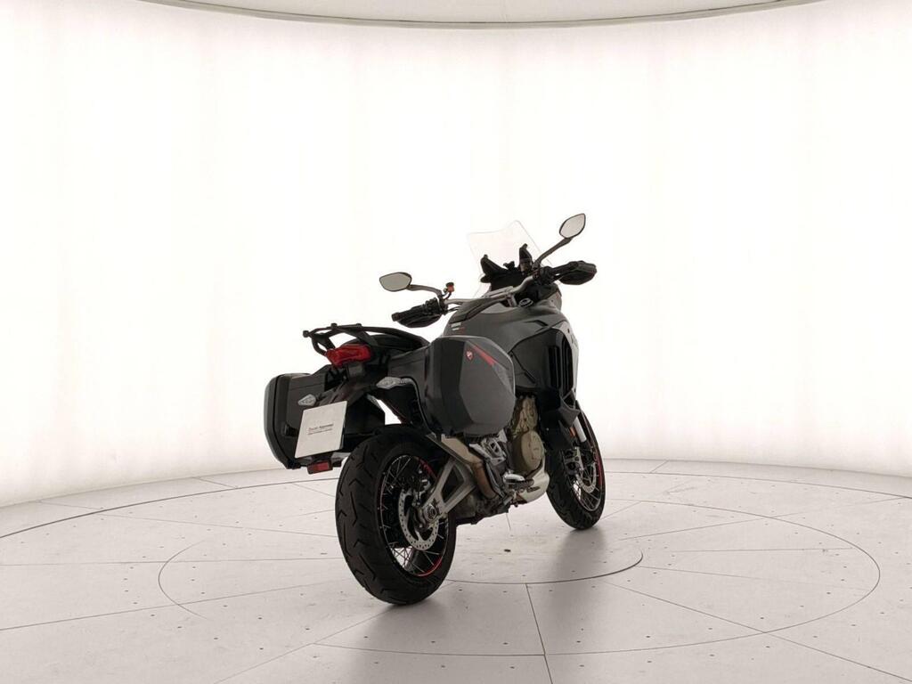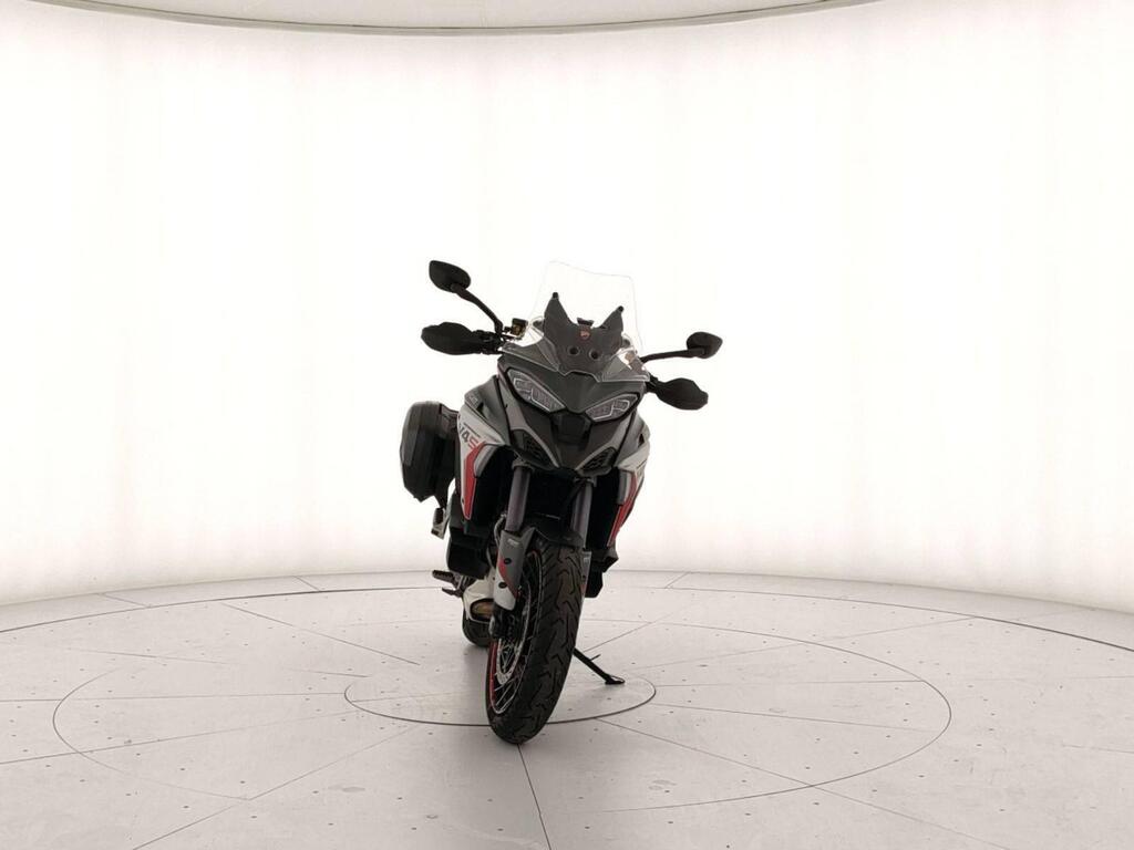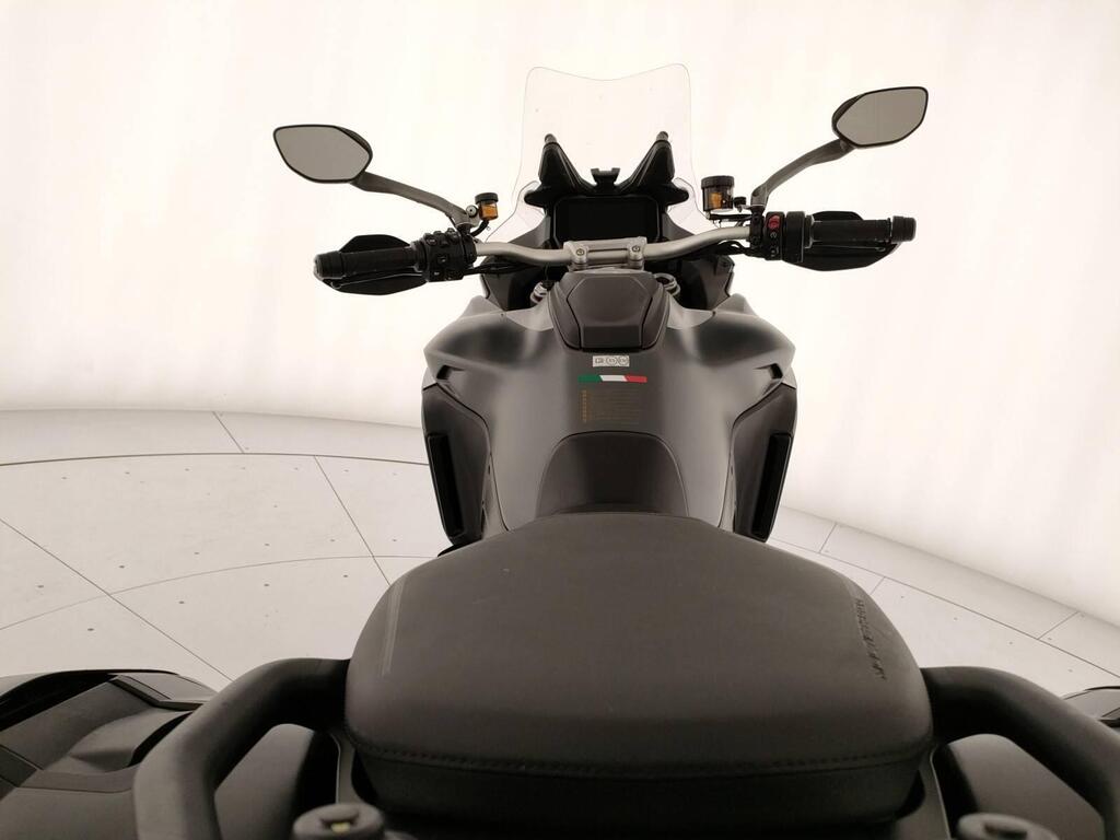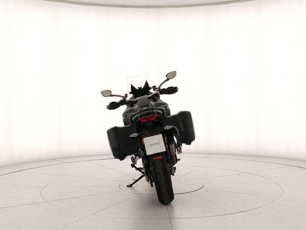 Top di gamma Travel: valigie laterali, manopole riscaldate, selle touring, sospensioni semiattive Skyhook Ducati, quickshifter, ABS cornering, traction control, cruise control e 4 riding mode. Schermo TFT color .